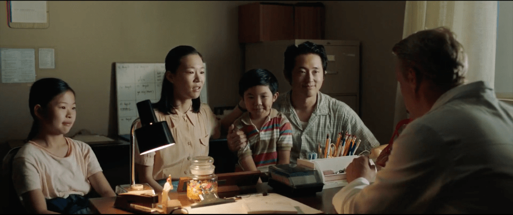 Al estilo de Alfonso Cuarón en Roma —aunque con resultados formalmente distintos—, el cineasta hizo un ejercicio de «investigación» en su propia memoria, a partir del cual surgió un guion compuesto de distintas viñetas que cuentan los retos de una familia tanto externos como internos ante determinadas decisiones y circunstancias. Quizá su mayor fuerza sea lo bien delineados de sus personajes, de una idiosincracia más bien recatada: el padre, estrictamente racional y que quiere sacar adelante una granja únicamente con sus propios medios (tremenda oportunidad para Steven Yeun, más conocido por sus roles cómicos en la pantalla chica, quien aquí cosechó una nominación al Oscar); y la madre (Yeri Han), la contraparte más sensata, que pone prioridad en la familia. La historia pivota en torno al niño protagonista, pero especial mérito tienen los personajes secundarios: la estupenda abuela atípica que se lleva la película (otra nominación, esta vez para una experimentada actriz del cine coreano, Yuh-Jung Youn), o el veterano de guerra de un cristianismo excéntrico pero devoto que interpreta Will Patton.