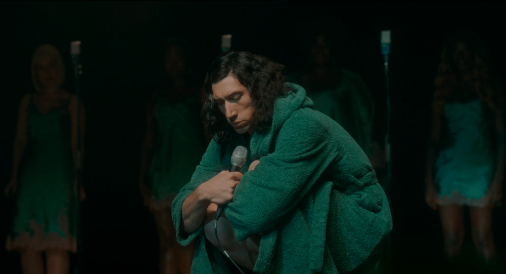 Ciertamente da la sensación de que algunas cosas sobran: al menos unos 30 minutos de su excesivo metraje que con afán de incluir las canciones no hace avanzar la trama y, siendo éstas muy buenas, terminan sintiéndose demasiadas. Lo mismo va por un par de escenas sexuales explícitas. Otro de sus puntos débiles es el poco balance entre los protagonistas, por el poco desarrollo del personaje de ella. El Henry McHenry de Driver es el verdadero protagonista y el actor —hijo de un ministro baptista sureño y una nativa americana que elige muy bien sus proyectos y a quien ya habíamos oído cantar en Historia de un matrimonio— hace un trabajo espectacular mostrando a un personaje que va directo al abismo. Hay momentos sublimes, como el desquiciado acto «cómico» de McHenry, apodado «el simio de Dios», o el monólogo en plano secuencia circular de Simon Helberg —el tercer actor que interviene en la trama— mientras dirige una orquesta. El final justifica parte del surrealismo con una metáfora que resulta muy adecuada. Vale la pena verla con ojo atento, también para detectar los divertidos cameos de los hermanos Mael y hasta uno de la cantautora mexicana Natalia Lafourcade. Un buen ejemplo de lo que el cine puede sintetizar del teatro y la música en un arte propio, visualmente poderoso.